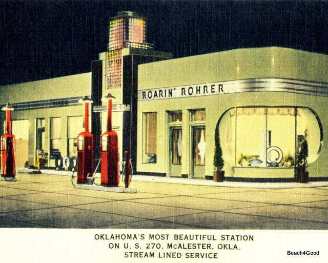 The style and function of gas stations has changed considerably in the last 70 years. Few gas stations have mechanics on site, people pump their own gas, they pay at the pump with debit or credit card. There is usually a convenience store, maybe a carwash and some take-out food. There are usually more than two pumps. There is usually a large and excessively lit canopy, to shelter customers from the elements, and give them a sense of safety under all that light. As the stations have grown, they occupy much larger lots.