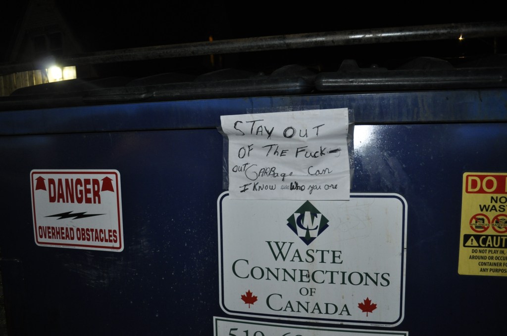- on garbage night a particular guy comes and drags neighbour’s garbage across the street to the dumpster area. He slashes the bags open to rifle through the contents, assisted by the very bright lighting. Then he opens the dumpster and starts pulling garbage bags from the dumpster and slashing them open. Then he leaves this mess, strewn around the dumpster and across the sidewalk. This is out of the sightlines of the station so the mess is left for between 5 – 10 days. Once a neighbour shovels it up in a rage. Another time they pay the “handyman” who built the fence atrocity to shovel it up. Someone composes this note taped to the dumpster: