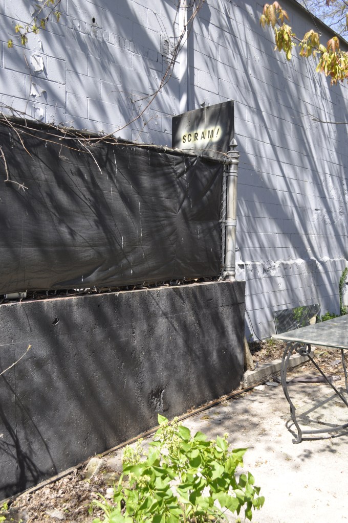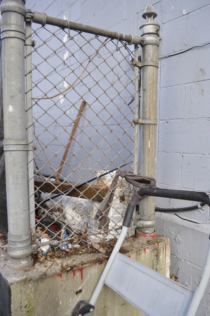 I had put the plywood up in the first place to prevent the cats slipping through the gap by the posts. I decided I would reattach it, with wire this time. I was even madder about the pile of crap dumped in this location. On warmer days, I had been smelling an unpleasant swampy dead smell from over there. I got mad enough to put the buckets, cut sign and broken vaccuum cleaner by their dumpster, so at least these weren’t handy to stand on to climb over the fence.