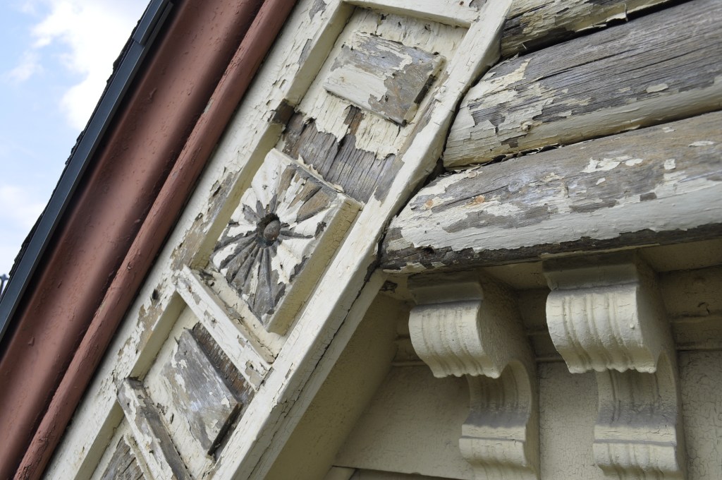 The historical sounding company got back to me first. A dude came, and we walked around the house. I was trying to be open minded, and asked open ended questions about what sort of products they would use, and how they would remedy the severe paint loss and damaged wood on the front of the house. This dude was dismissive of my painting efforts to date, claiming that I was using paint with the “wrong sheen” (I had used Benjamin Moore Low Lustre). He also told me how I had been painting it all wrong(I had started from the bottom up – which really isn’t the way it should be done, I admit), and how there was “no point” in having done the heat stripping that I spent many hours on. (I know of no other remedy for loose flaking paint. It is pointless to paint OVER it – and any exposed wood that has silvered needs to get sanded back to the brown wood level or no paint will properly adhere.) This dude’s solution was to paint over everything with this thick goop – “elastomeric” paint – to somehow adhere the loose paint and smooth out the surface. He had dried samples of this and some kind of super caulk. He pulled on the dried paint samples and stretched it to show me these magical properties, and told me it was extremely expensive. He pointed to trivial cracks on the surface that was already painted and talked about how this goop could fill in those cracks. The gables have a LOT of decorative details, including incised lines and embossing. I wasn’t sure how this was compatible with this ultra thick goop as it would obliterate these details. He talked a lot about how many positive Yelp, Google and Houzz reviews his painting business had – operating under numerous names, one with a trendy buzzword. Hundreds of 5 star reviews ! He gave me several fridge magnets with his business name, went in his vehicle and fiddled around a bit, then came back out. He had a verbal quote for me. To paint my two decorative gables in a multicolor paint scheme, and the two plain gables at the back would cost $ 7300, plus tax, and I had to supply the paint. Hmmm. That seemed like a LOT to me, but what did I know ? I asked him if he could email me that quote, with the specifics, and if he could email me photos of similar historical exteriors that his company had painted ? I also asked for him to send the material data sheet for this magic goop*, as I had NEVER heard of this product being used, let alone on exposed raw, damaged wood. He said he would and drove off.
