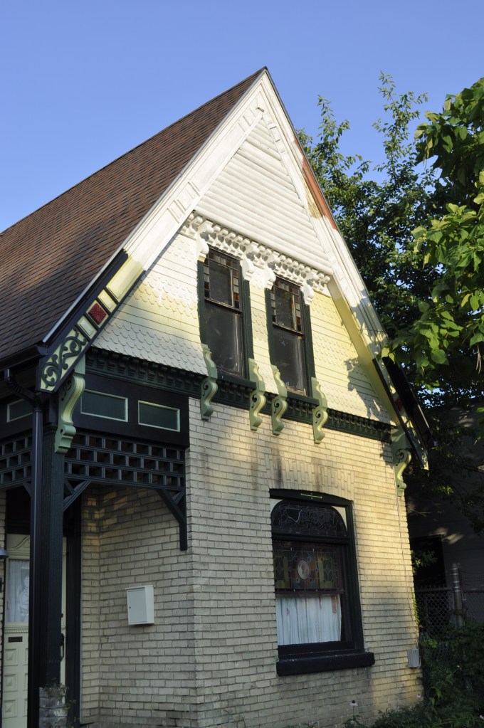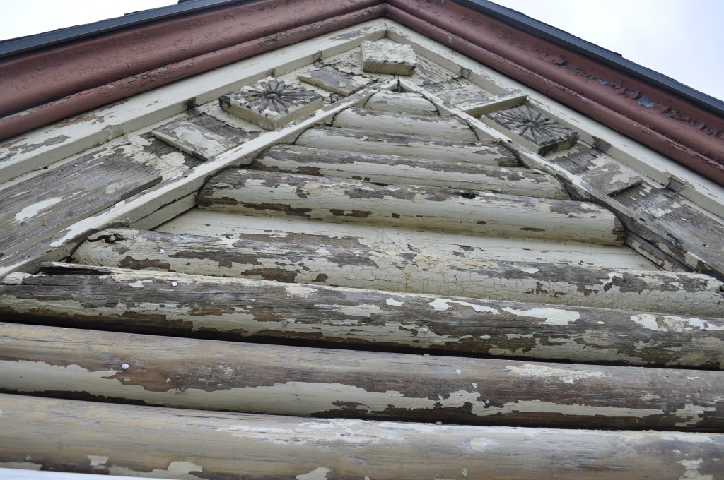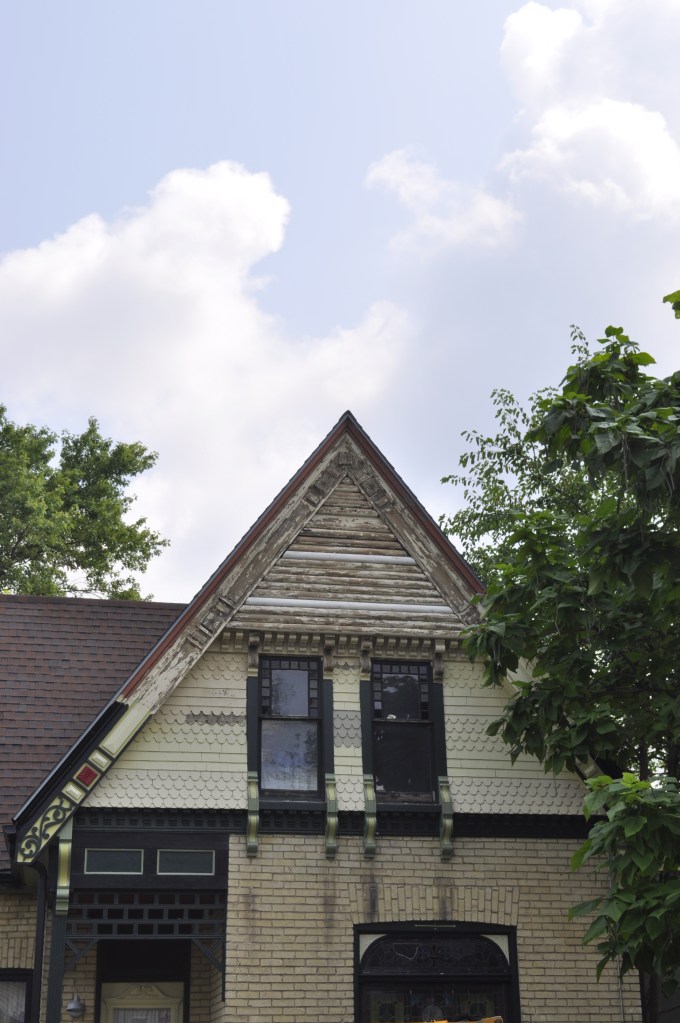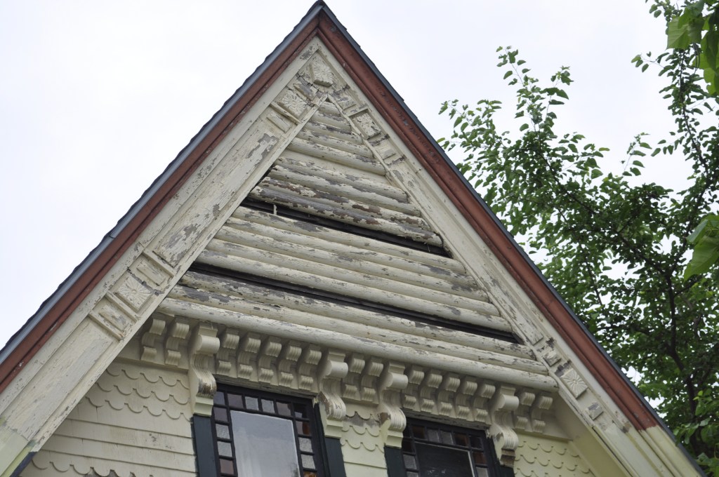 Oddly, I discovered that the wood in the three small closets – that probably had coat hooks mounted onto it – was EXACTLY the same profile of the log pieces, and an identical size. I saved what I removed from a closet upgrade and felt relieved by this discovery. As the exterior has an unusual amount of embellishment and decorative what-nots, the inclusion of plain log-type boards was…odd ? And even odder that it was closet wood ? Though houses all over London have what appear to be interior trim corner blocks as an exterior gable detail – so why NOT closet wood ? Two of the longer logs had fallen off since I moved in, and one near the top was gone from before my residency. Luckily the closet wood was more than long enough to replace this piece.