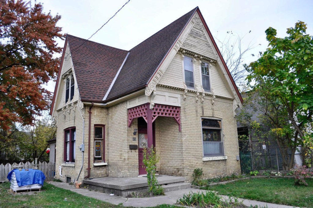 I felt a multicolored paint scheme could accentuate the best features, but it had to be chosen and placed carefully, like successful make-up. Several high contrast colors on the embellished details looked tacky – like a color fistfight – as too many details fought for visual domination. The exterior has so many areas of interest – small, medium and large corbels, two types of decorative shingles, a repeating pattern in the gable pattern, those weird log things, plus two types of stained glass, dentile trim around the living room window, carved flower corners on the living room window plus incised lines and dots that were kind of Eastlake-something. Not only did I have to choose colors that would work with the brick and the roof, the colors had to work well as a community.